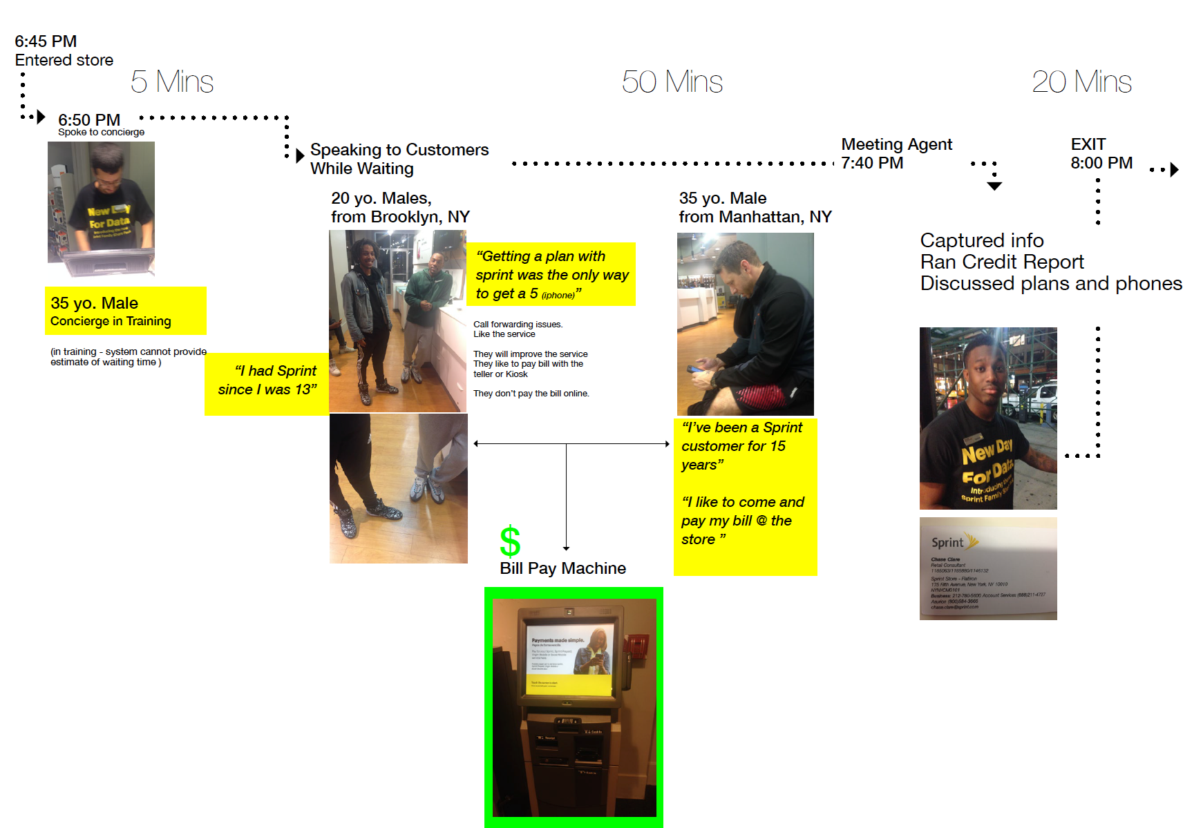 As part of Figliulo & Partners' pitch for Sprint's account, I conducted hands-on ethnographic research—spending 75 minutes opening an account myself and interviewing customers in-store. The research revealed critical pain points: no wait time estimates, inefficient account creation (20 minutes just to capture info and run credit), and customers who preferred in-store bill payment because they lacked online payment options. I also discovered that for many, getting a Sprint plan was simply the way to get an iPhone. These insights became central to our strategic approach and helped Figliulo & Partners secure Sprint as the agency's founding client in 2013.